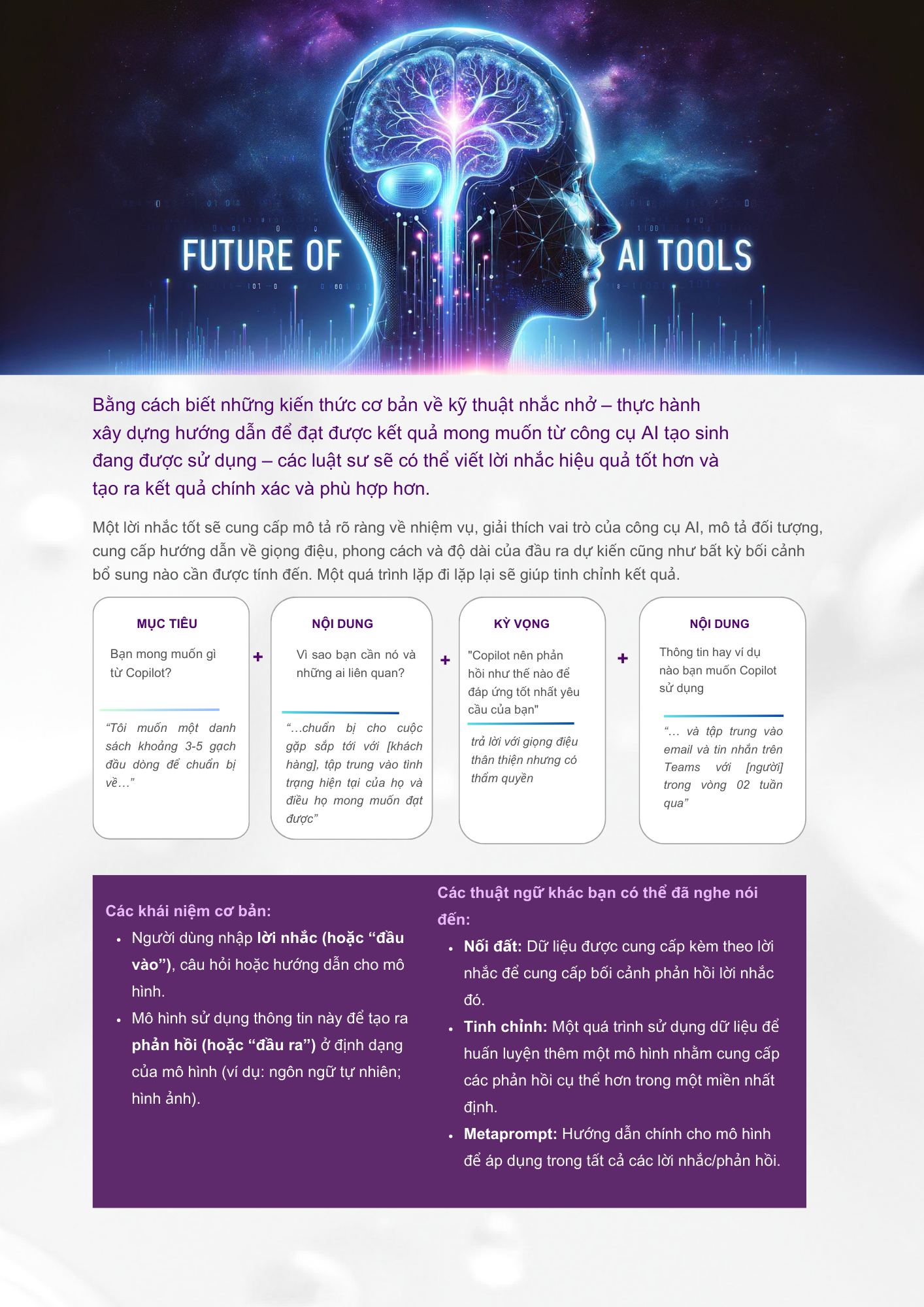 thực hành xây dựng hướng dẫn để đạt được kết quả mong muốn từ công cụ AI tạo sinh đang được sử dụng – các luật sư sẽ có thể viết lời nhắc hiệu quả tốt hơn và tạo ra kết quả chính xác và phù hợp hơn.