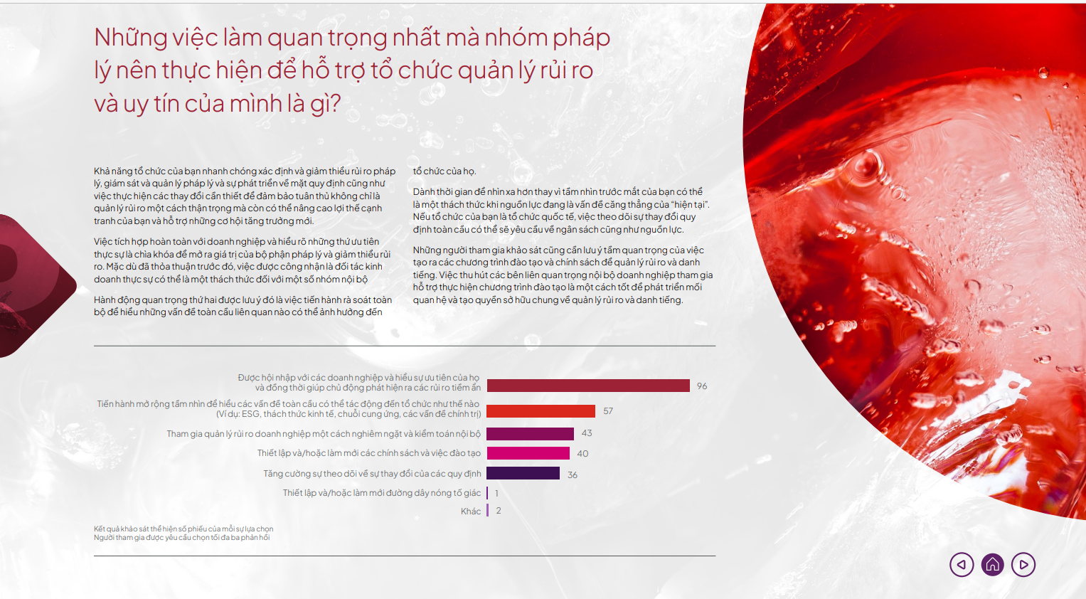 Đại đa số người được khảo sát đều “rất tự tin” hoặc “tự tin” vào khả năng của họ trong việc xác định và quản lý rủi ro, quy định phát sinh. Qua việc khảo sát cho thấy, đối với 29% số người được hỏi cần cải thiện và tập trung hơn nữa trong việc theo dõi và quản lý những rủi ro phát sinh. Việc sẵn sàng phát triển các chính sách và quy trình là chìa khóa để tạo ra văn hóa tuân thủ một cách mạnh mẽ và linh hoạt. Vì vậy, dù các nhóm có sử dụng công nghệ hay bên thứ ba để hỗ trợ việc này, họ cần xây dựng các chiến lược để đảm bảo có đủ điều kiện cần thiết để đáp ứng.