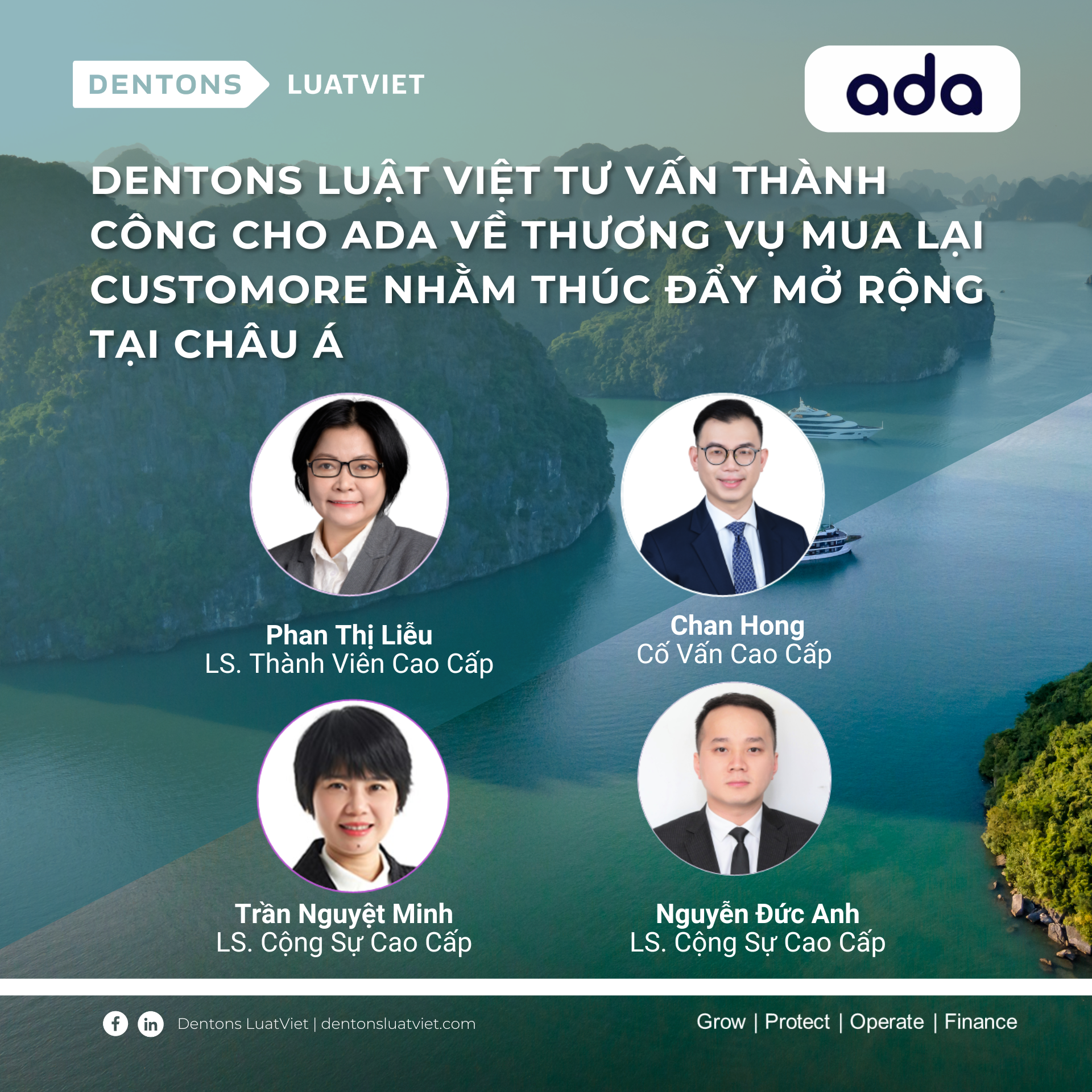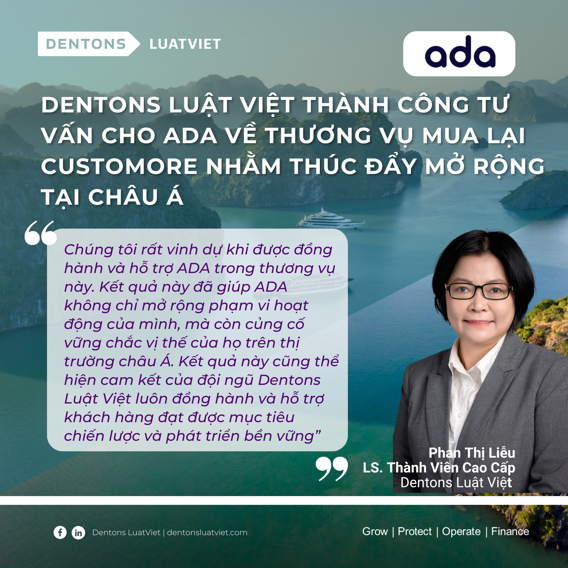 Luật sư Phan Thị Liễu chia sẻ: “Chúng tôi rất vinh dự khi được đồng hành và hỗ trợ ADA trong thương vụ này, góp phần giúp ADA không chỉ mở rộng phạm vi hoạt động của mình, mà còn củng cố vững chắc vị thế của họ trên thị trường châu Á. Kết quả này cũng thể hiện cam kết của đội ngũ Dentons Luật Việt trong việc luôn đồng hành và hỗ trợ khách hàng đạt được mục tiêu chiến lược và phát triển bền vững”.
