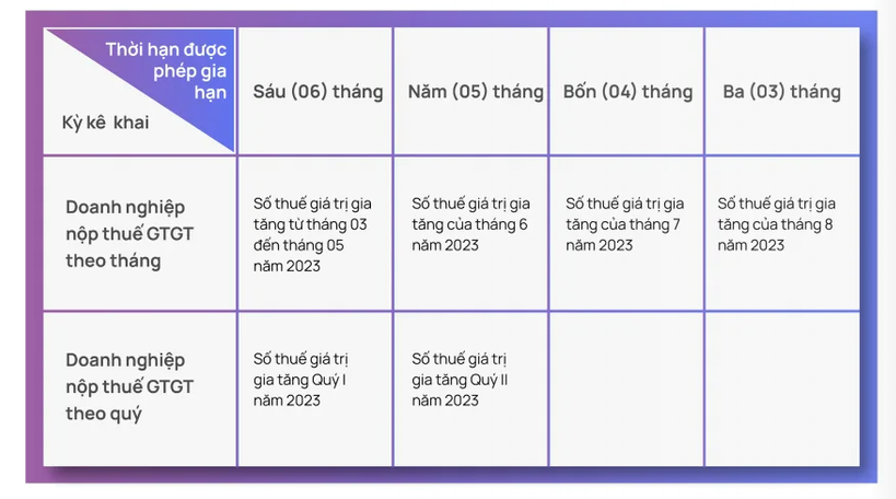 Thời hạn được phép gia hạn được liệt kê trong bảng dưới đây: