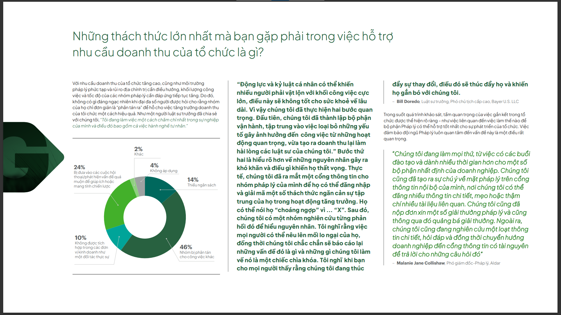 “Bạn nghe thấy các nhóm nói rằng họ bị phân tán do khối lượng công việc và nguồn lực hạn chế. Bộ phận pháp lý thường là nguồn ổn định và nhất quán, do đó doanh nghiệp có xu hướng dựa vào bộ phận pháp lý cho những công việc ngoài